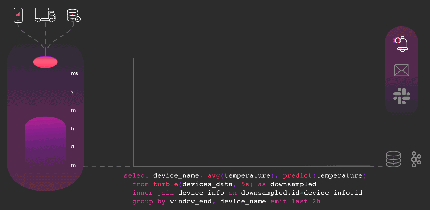 Data streaming processing pipeline via streaming SQL. The results can be written to native Timeplus stream or external systems.